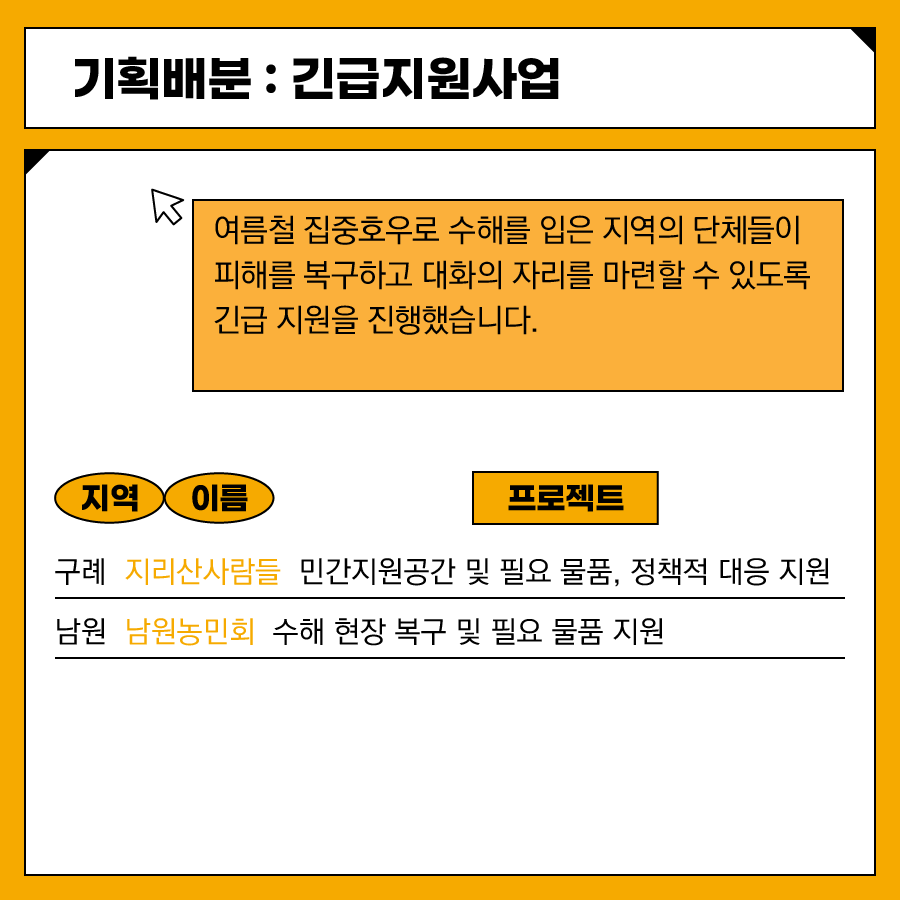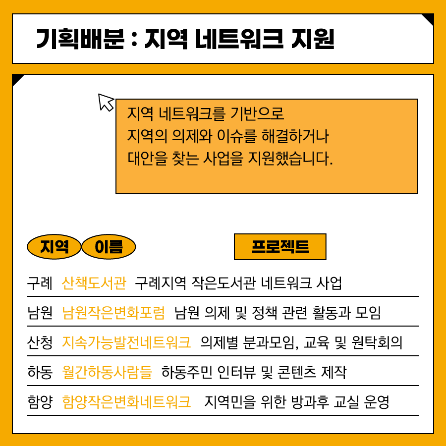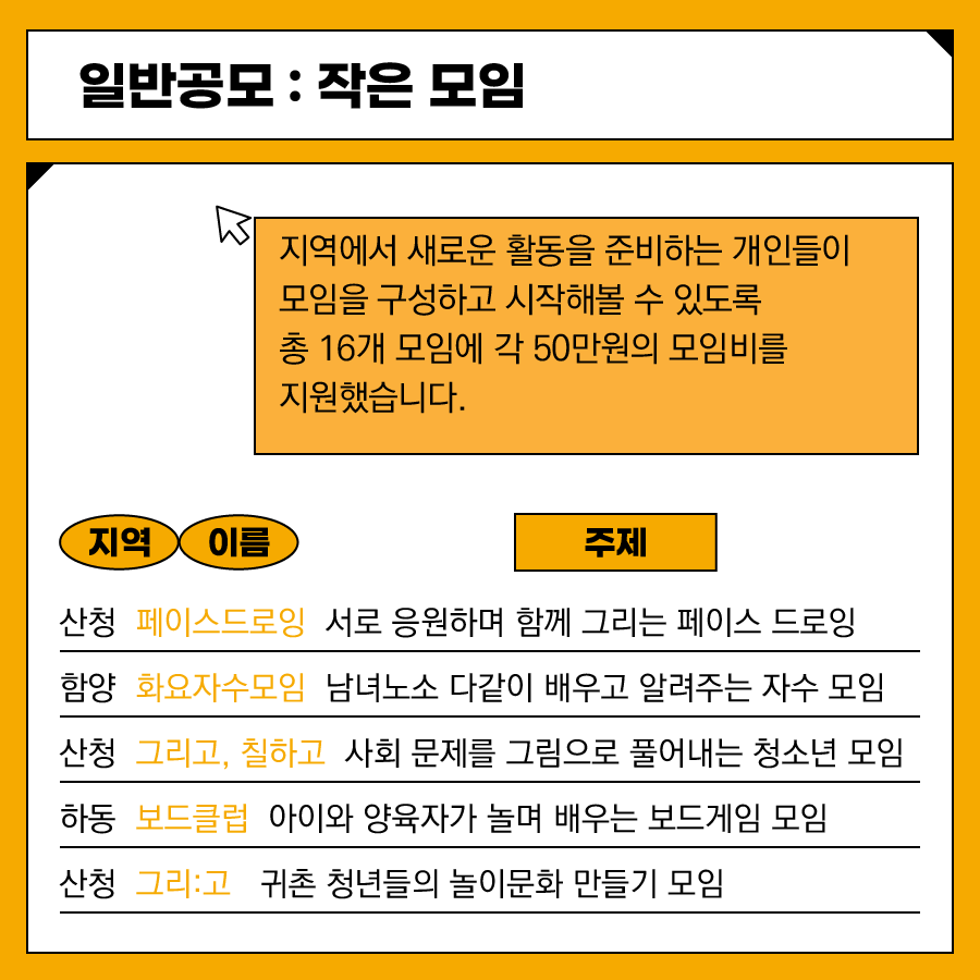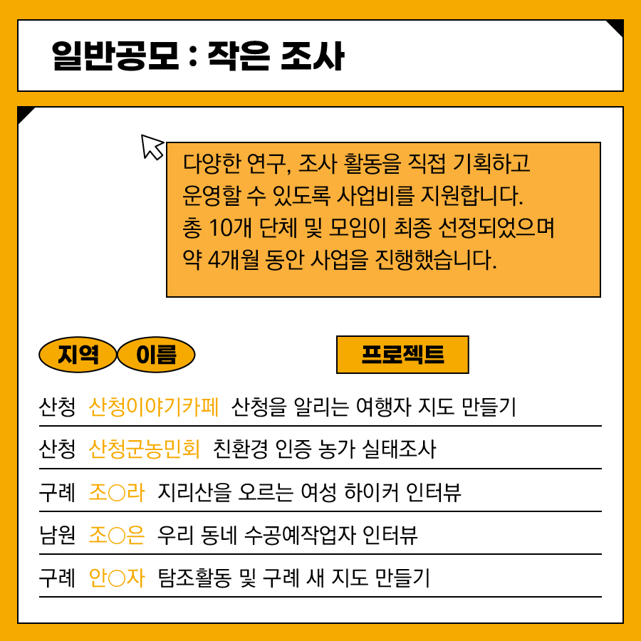 다사다난했던 2020년, 지리산 작은변화지원센터가 지역사회와 함께 진행한 활동들을 카드뉴스에 꽉꽉 눌러담아 정리합니다. 총 6부로 구성했습니다.