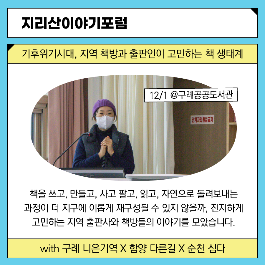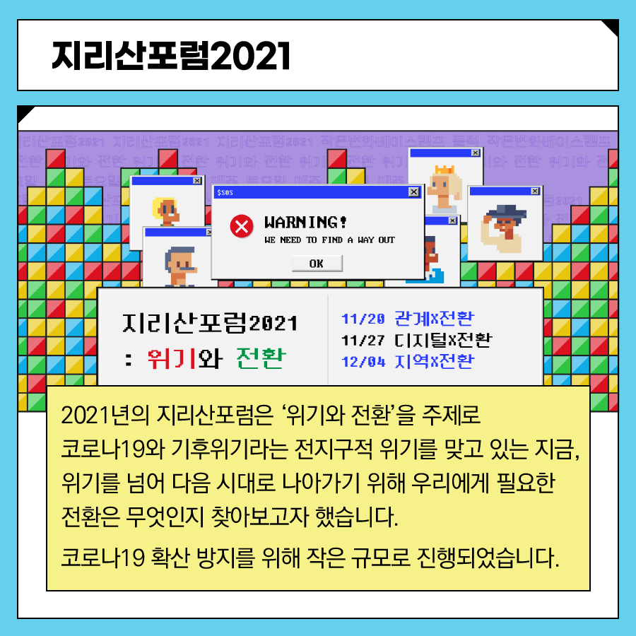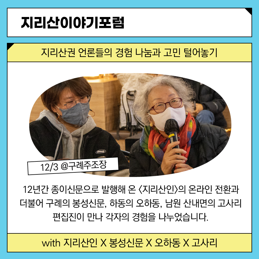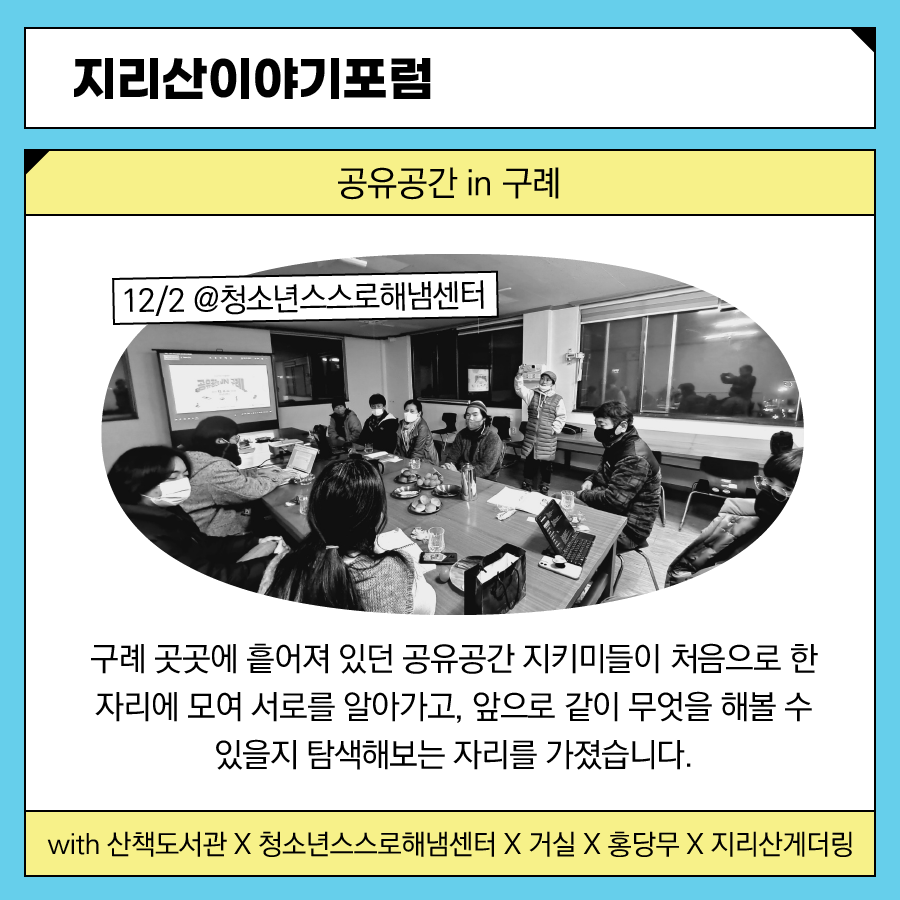 다시 돌아보는 2021년, 지리산 작은변화지원센터가 지역사회와 함께 진행한 활동들을 카드뉴스에 꽉꽉 눌러담아 정리합니다. 총 5부로 구성했습니다.