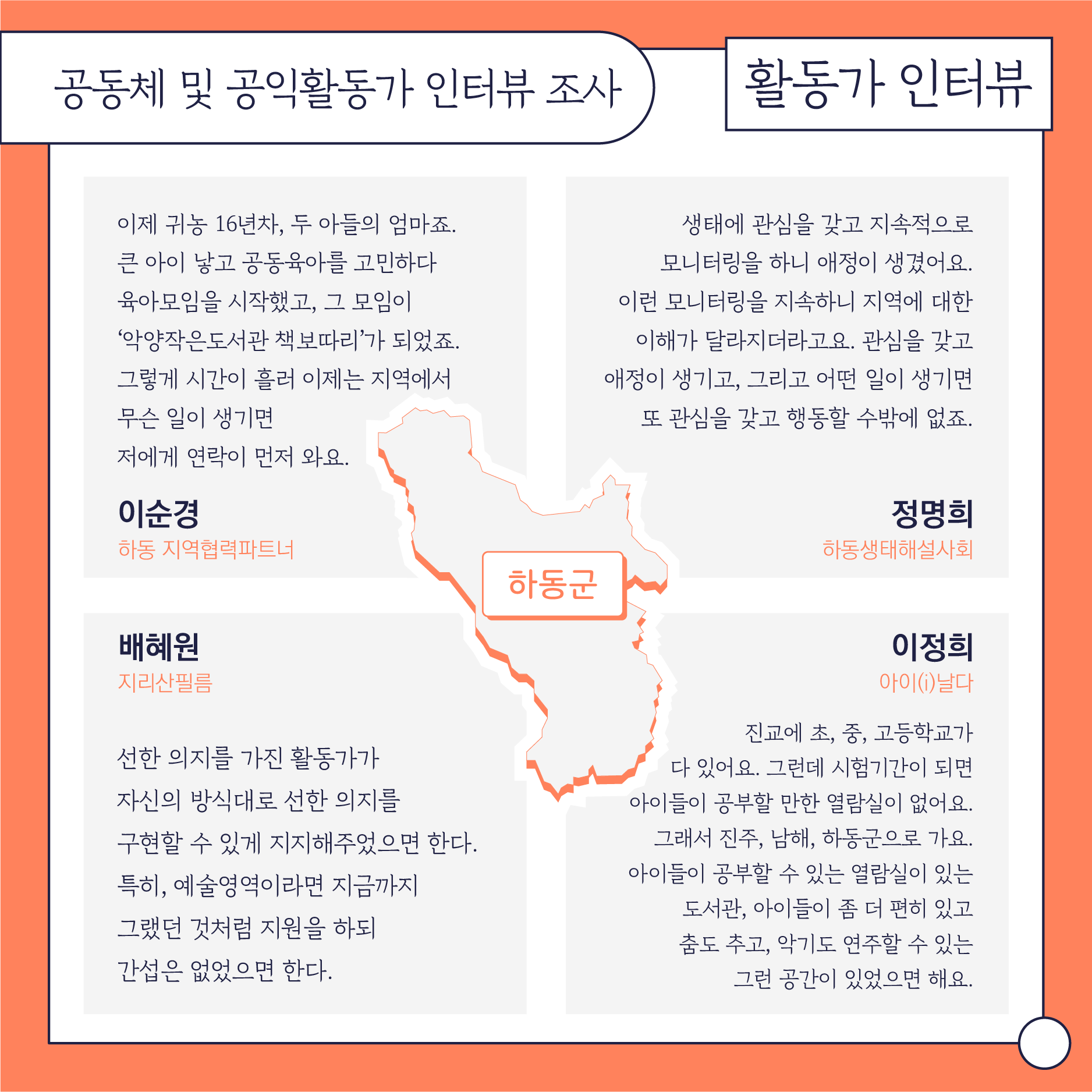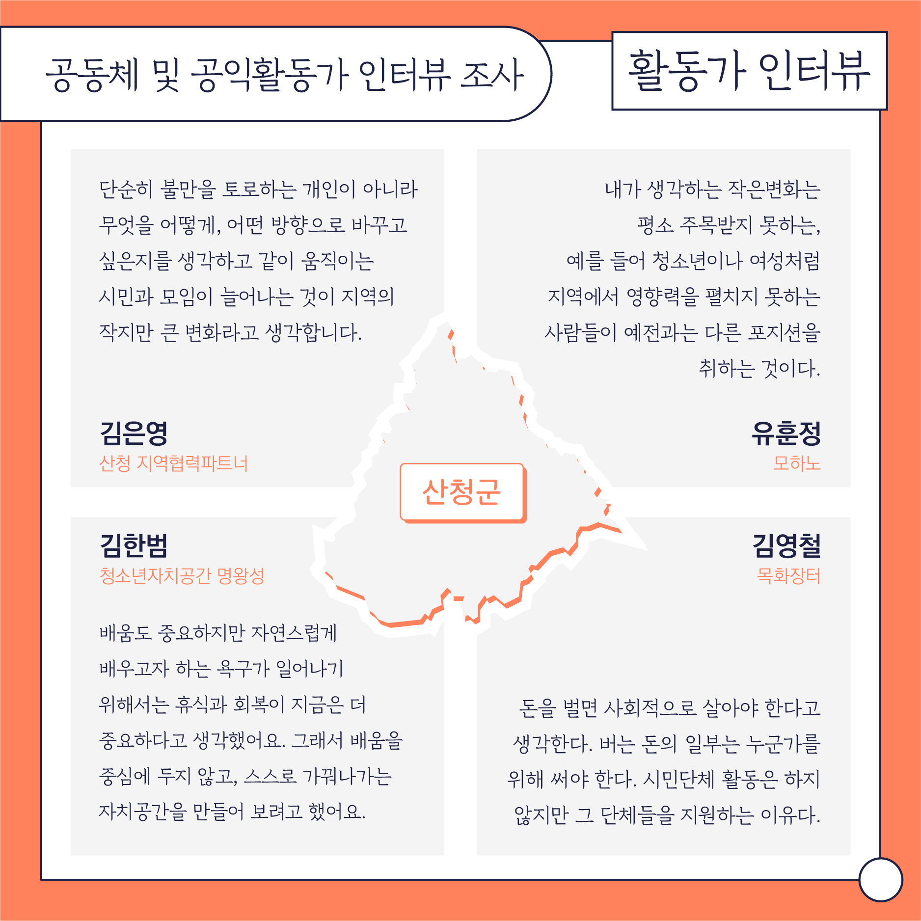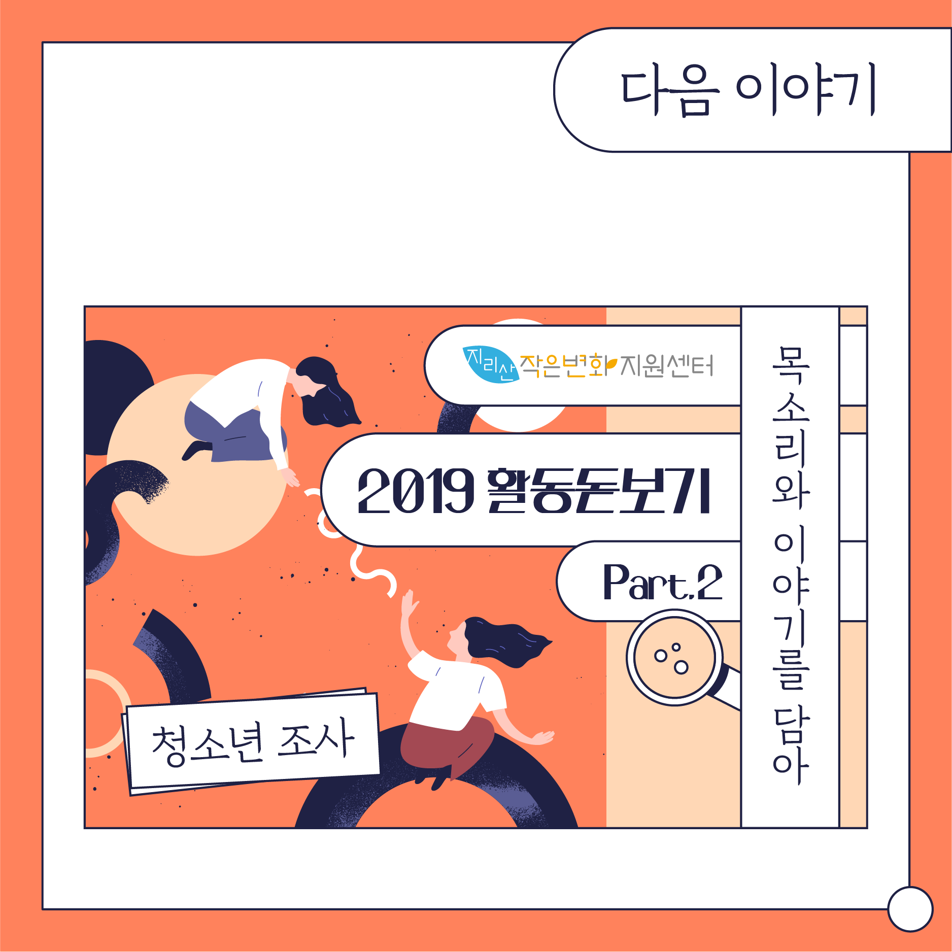 첫번째 파트인 '함께 틔우는 변화의 씨앗'에서는 5개시군에서 있었던 지원사업과 관련 활동들을 정리합니다. 두번째 파트인 '목소리와 이야기를 담아'에서는 작년에 조사사업의 일환으로 청소년과 지역 활동가들의 목소리를 들었던 작업을 나눕니다. 마지막 '배움으로 연결되는 현장'에서는 센터에서 진행한 교육과 워크샵, 지리산포럼을 담았습니다.