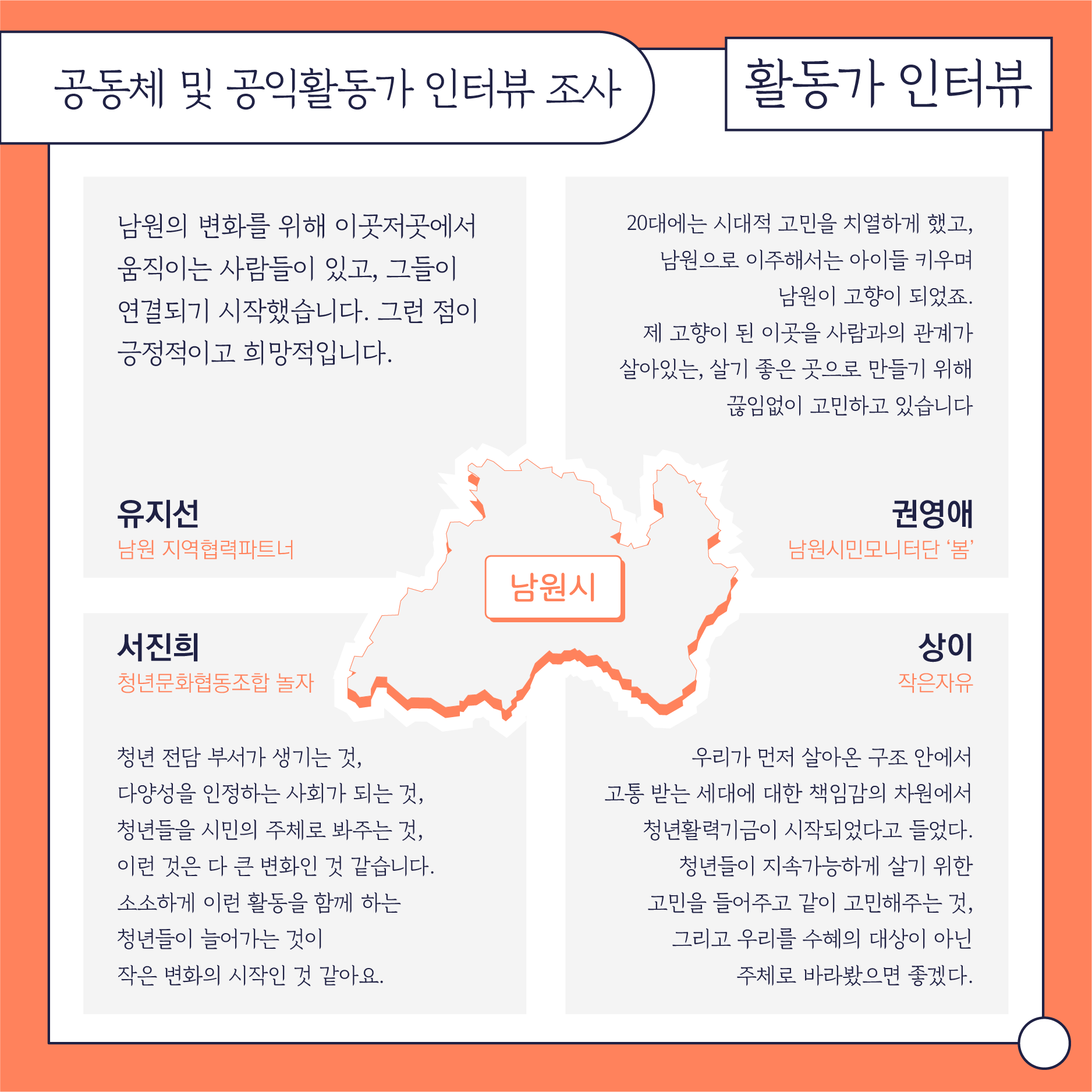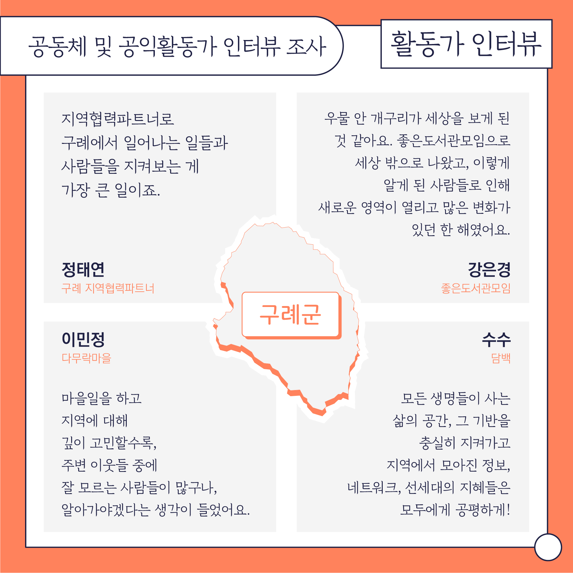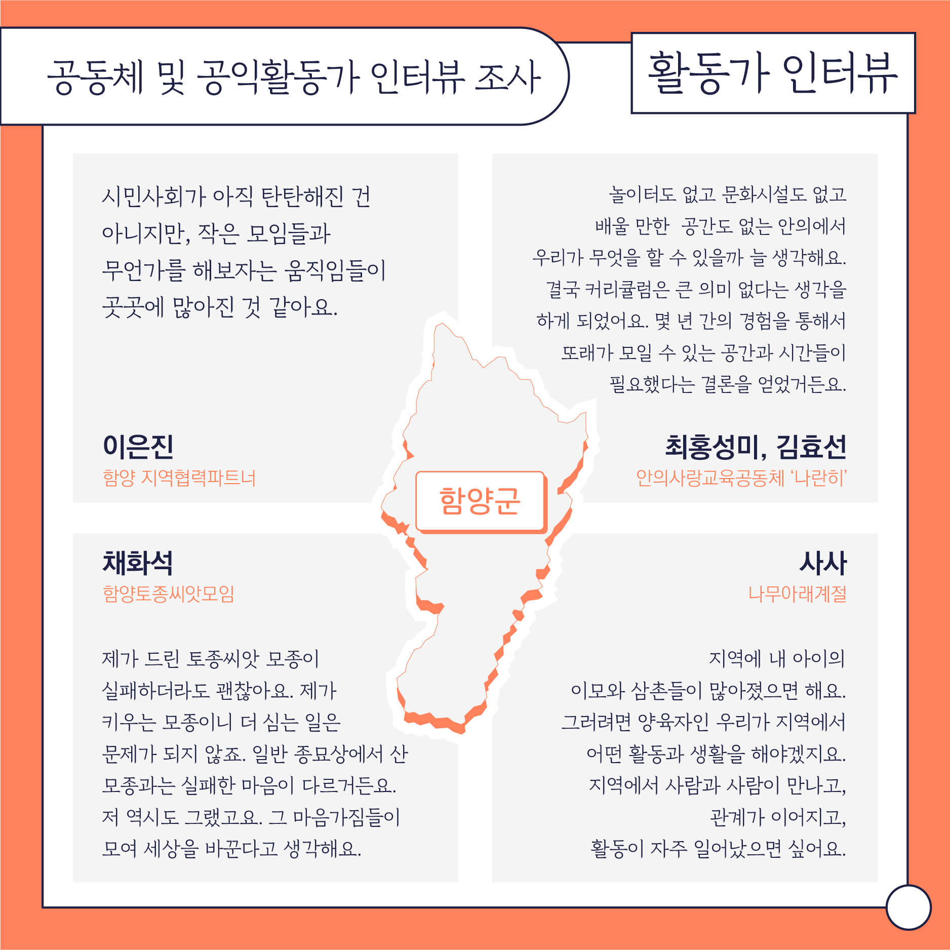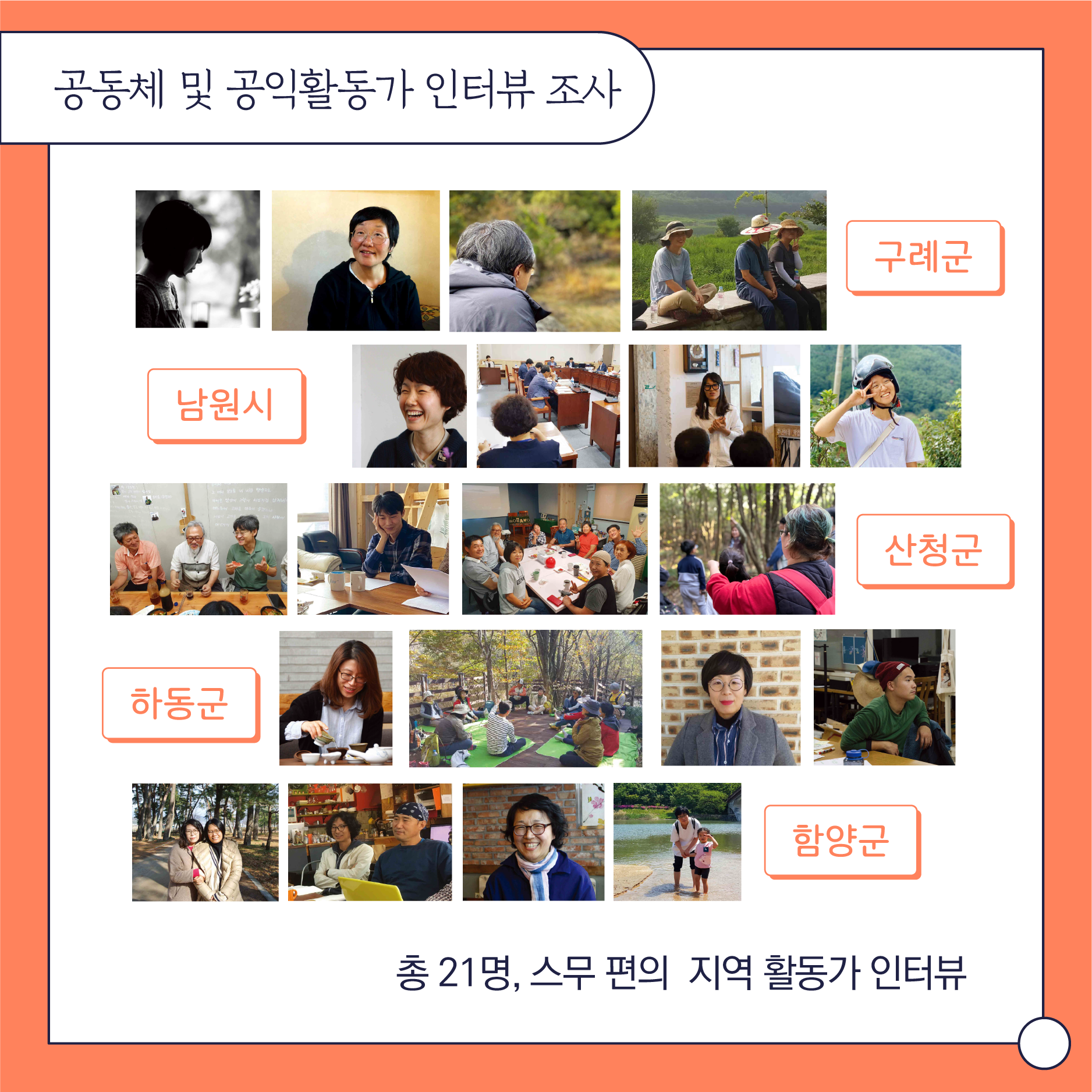 첫번째 파트인 '함께 틔우는 변화의 씨앗'에서는 5개시군에서 있었던 지원사업과 관련 활동들을 정리합니다. 두번째 파트인 '목소리와 이야기를 담아'에서는 작년에 조사사업의 일환으로 청소년과 지역 활동가들의 목소리를 들었던 작업을 나눕니다. 마지막 '배움으로 연결되는 현장'에서는 센터에서 진행한 교육과 워크샵, 지리산포럼을 담았습니다.