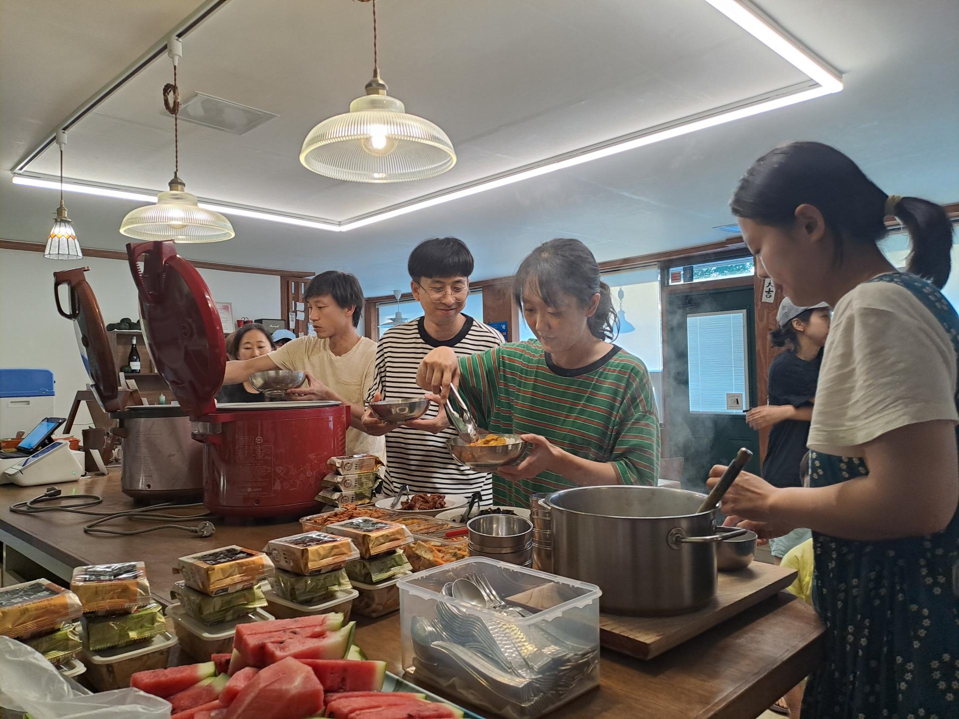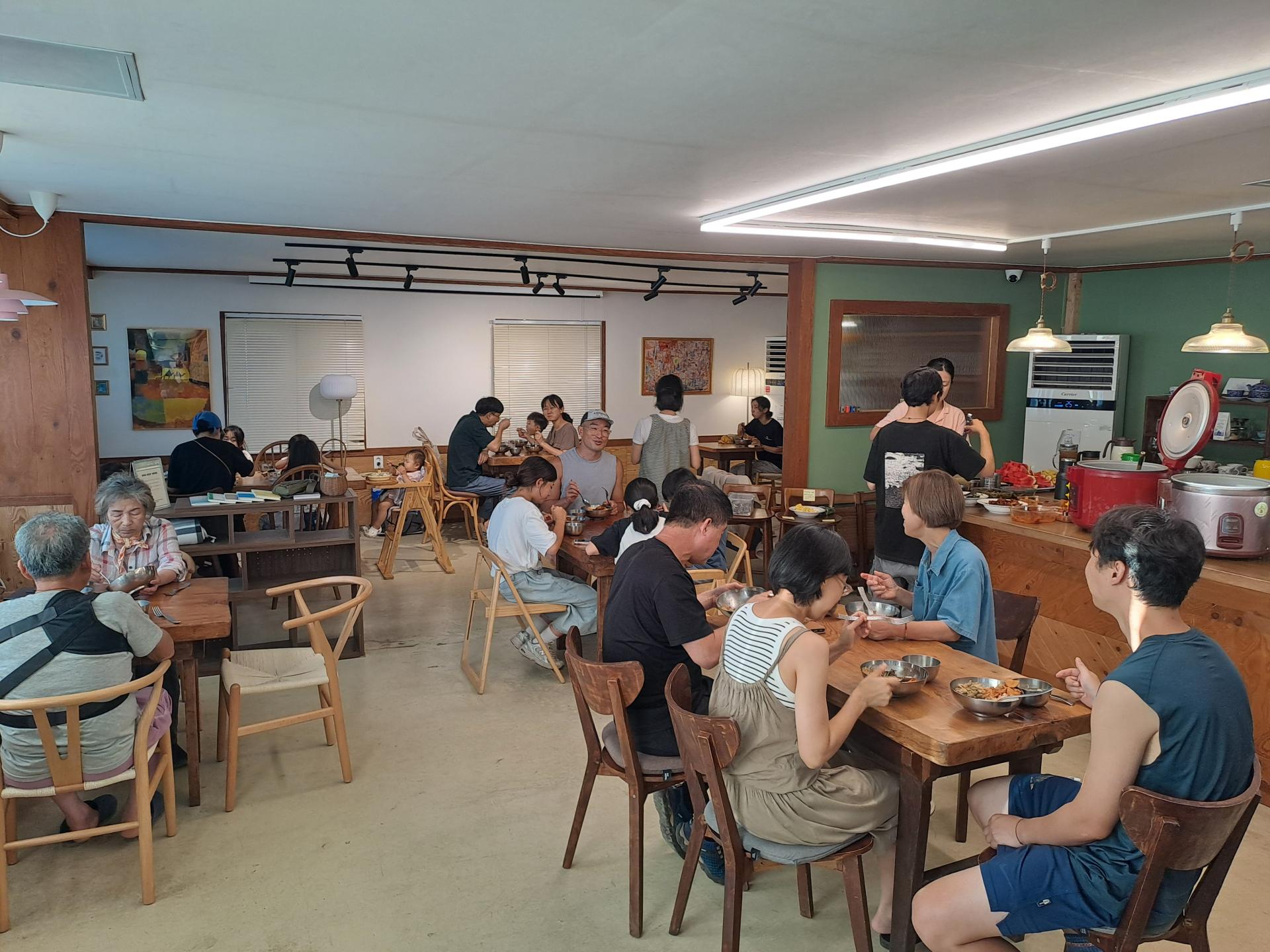 봉사자들이 식사하러 많이 오셨는데 그런 걸 보며 일상화된 재난의 시기에 어떻게 대처해 나가야 하는가에 대해 깊이 살펴보는 계기가 되기도 했어요. 재난이 발생했을 때 정부나 큰 단체가 해야 하고, 할 수 있는 일들이 있겠죠. 그건 그것대로 하되 재난의 피해자이자 당사자인 ‘우리는 어떻게 해야 하는가.’에 대한 답변이 사실 ‘지금 우리가 하고 있는 이런 방식 외에는 달리 어떤 방법이 있나’하는 생각이 들었어요. 피해 입은 이웃과 친구들에게 내가 가진 작은 것을 나누고 작게나마 도움이 될 수 있는 일, 예를 들면 집을 같이 치우고, 밥해서 같이 나누어 먹고, 아이를 잠깐이라도 돌봐주는 일 말고는 또 뭘 할 수 있겠어요? 그러면서 서로 물질적인 도움뿐만 아니라 위안과 위로도 주고받고요. 다음 재난은 언제 어디서 일어날지 누구도 예측하기 어려워요. 그 말은 다음 재난은 나, 우리 집, 우리 마을에서 일어날 수 있다는 거죠. ‘일상화된 재난’이라는 말을 하잖아요. 이번엔 산청이었지만 그 비구름이 하동에 멈췄으면 하동에 재난이 나는 거죠. 아무리 예방이 잘 되어도 자연재해는 감당해 낼 수 없는 것 같기도 해요. 일이 벌어졌을 때 어떻게 지혜롭게 극복할 것인지를 우리끼리 잘 찾아야 해요. ‘오래된 미래’처럼 우리 안에 답이 있다고 생각해요. 상부상조와 두레 같은 것들. 그것 말고는 달리 해 볼 수 있는 게 뭐가 있을까 싶어요. 현대 사회에 맞게 변형해 적용해내는 운영의 묘를 잘 살려보면 좋을 것 같아요.