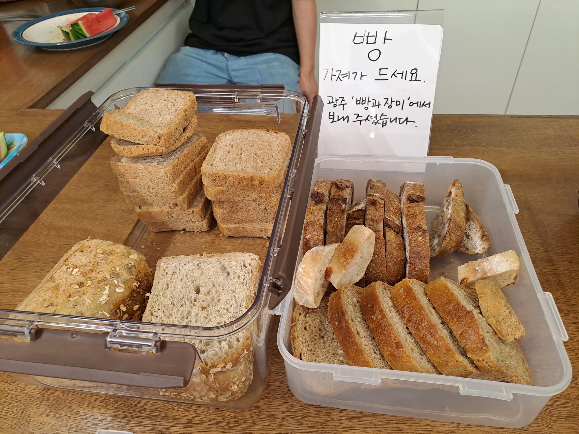 광주와 함양의 빵집에서 보내준 빵을 함께 나누어 먹고 수해 농가에 전달했다.