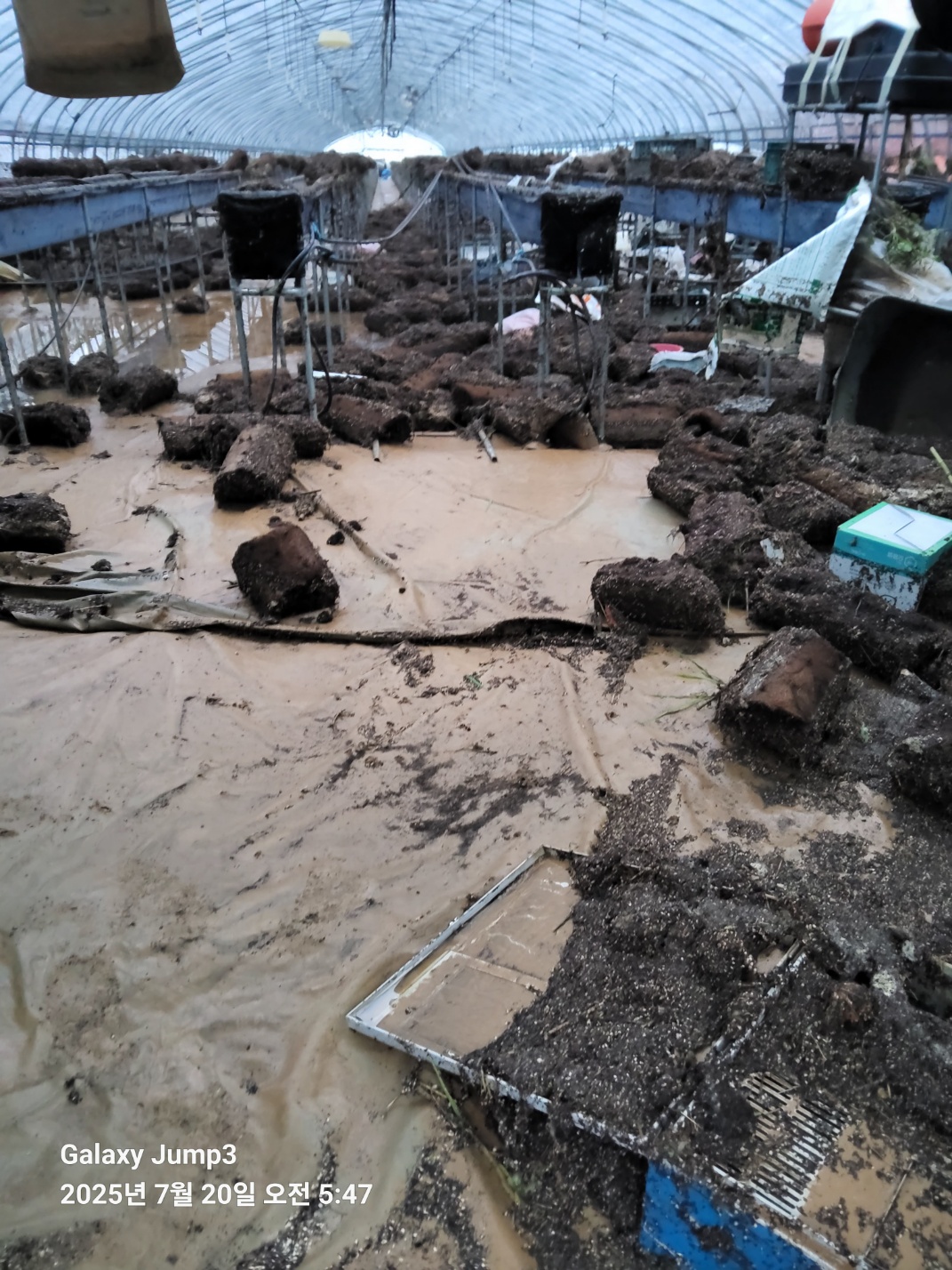 “개 두 마리를 모닝에 태워 빠져나왔어요. 개천이 넘치는데 그 작은 차로 빠져나오려니 무섭더라고요. 찻길로 나오긴 했는데 여기저기 토사가 쌓이고 나무가 쓰러져서 다 막혀 있는 거예요. 이리저리 왔다 갔다 하면서 돌고 돌다가 겨우 원지 큰길로 나가서 대평 동생네로 갔죠. 그런데 뒤따라 올 줄 알았던 아저씨가 안 오는 거라. 전화를 하니까 개 한 마리가 안 보여서 찾다가 시꺼먼 황토물이 밀려와서 농장 꼭대기에 있는 작은 농막으로 피했대요. 이제 비가 그치고 물이 빠지고 있으니까 괜찮다면서 자기는 거기 있겠다고. 그러면서 하는 말이 하우스가 다 잠기고 엉망이 됐다는 거예요. 그때 내가 거짓말! 하고 소리쳤는데 다음날 와보니까 남편 말이 사실이더라고요. 우리 농장 너머 제방 가까운 쪽에 농가가 두 군데 더 있거든요. 한 집은 하우스 3개 동, 또 한 집은 8개 동 이렇게 농사를 짓는데, 그게 물에 쓸리면서 우리 농장으로 다 밀려왔어요. 그 하우스들은 뼈대까지 다 무너졌죠. 우리는 하우스 방향이 달라서 물이 사이사이로 빠져나가는 바람에 그나마 (골조는) 살아남았고.”