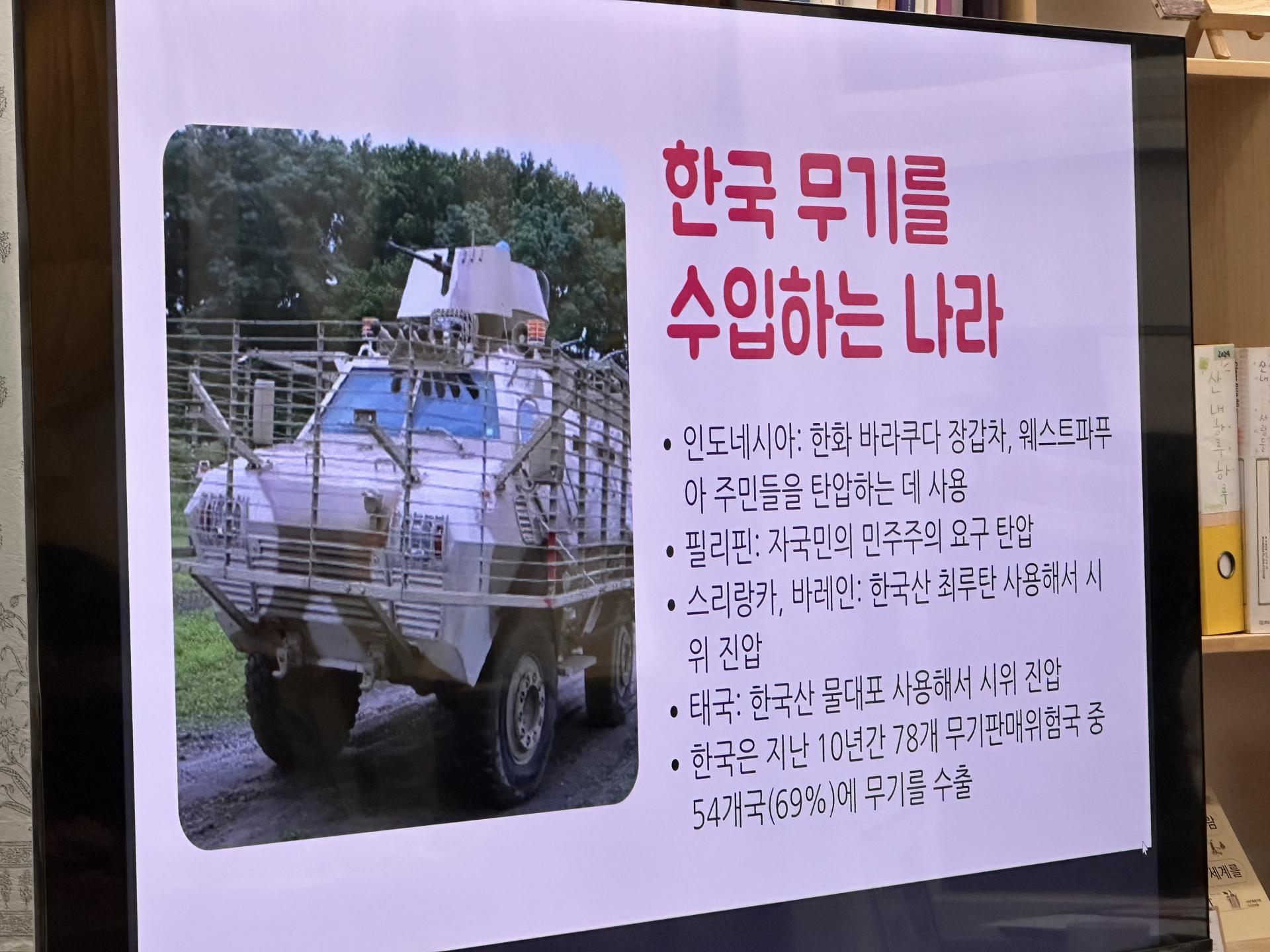 한국은 지난 10년 동안 78개국에 무기를 수출했고, 그중 54개국(69.2%)이 무기 판매 위험국이었다. 독재 국가이거나 전쟁 중인 국가이기 때문에 무기를 판매했을 시 자국민이나 이웃 나라 민간인에게 사용될 가능성이 높은 국가에게 무기를 판매한 것인데, 이 활동가에 의하면 한국도 이를 모르지 않았다. 우리나라에서 생산된 전쟁무기는 실제로 팔레스타인 학살에서, 예멘 반군의 수류탄에서, 분리독립을 요구하는 웨스트파푸아 주민들을 탄압하는 장소에서 쓰이고 있다. 반면 한국의 난민 인정률은 2022년 2.03%, 2023년에는 1.53%에 불과하며, 나아가 전쟁과 내전을 법적인 난민 인정 사유로 인정하고 있지 않다.