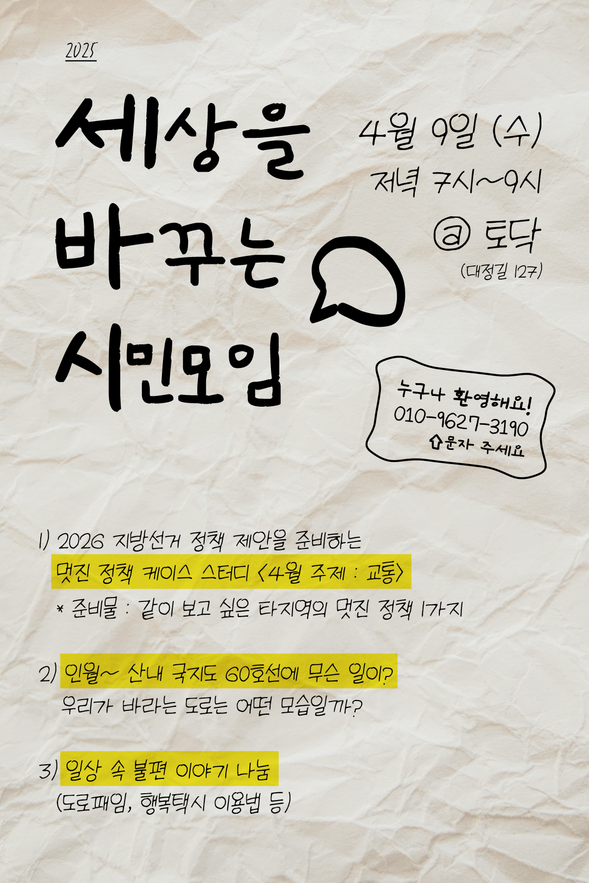 4/9 (수) 7시 <세상을 바꾸는 시민모임>에 초대합니다. ⠀ 토닥에서는 작년부터 한 달에 1번 모여서 이런 저런 사는 이야기, 일상 속 불편 이야기, 행정에서는 요즘 무슨 사업들을 하고 있는지 등등 함께 두런두런 이야기 나누는 모임을 하고 있습니다. ⠀ 올해는 매월 주제를 정하고 (교통, 여성, 어린이 등등!) 남원시도 이런 정책을 시행했으면 좋겠다! 남원에서는 어떻게 맞춤형으로 적용할 수 있을까? 하는 <멋진 정책 케이스 스터디> 해보려고 합니다. ⠀ 여기 더해서 이런 이야기들 나눠보려고 해요. 산내를 중심으로 생활하신다면 누구든 함께하실 수 있어요. ⠀ ⠀ 1) 2026 지방선거 정책 제안을 준비하는 멋진 정책 케이스 스터디 <4월 주제 : 교통> * 준비물 : 같이 보고 싶은 타지역의 멋진 정책 1가지 ⠀ 2) 인월~산내 국지도 60호선에 무슨 일이? 우리가 바라는 도로는 어떤 모습일까? ⠀ 3) 일상 속 불편 이야기 나눔 (도로패임, 행복택시 이용법 등)