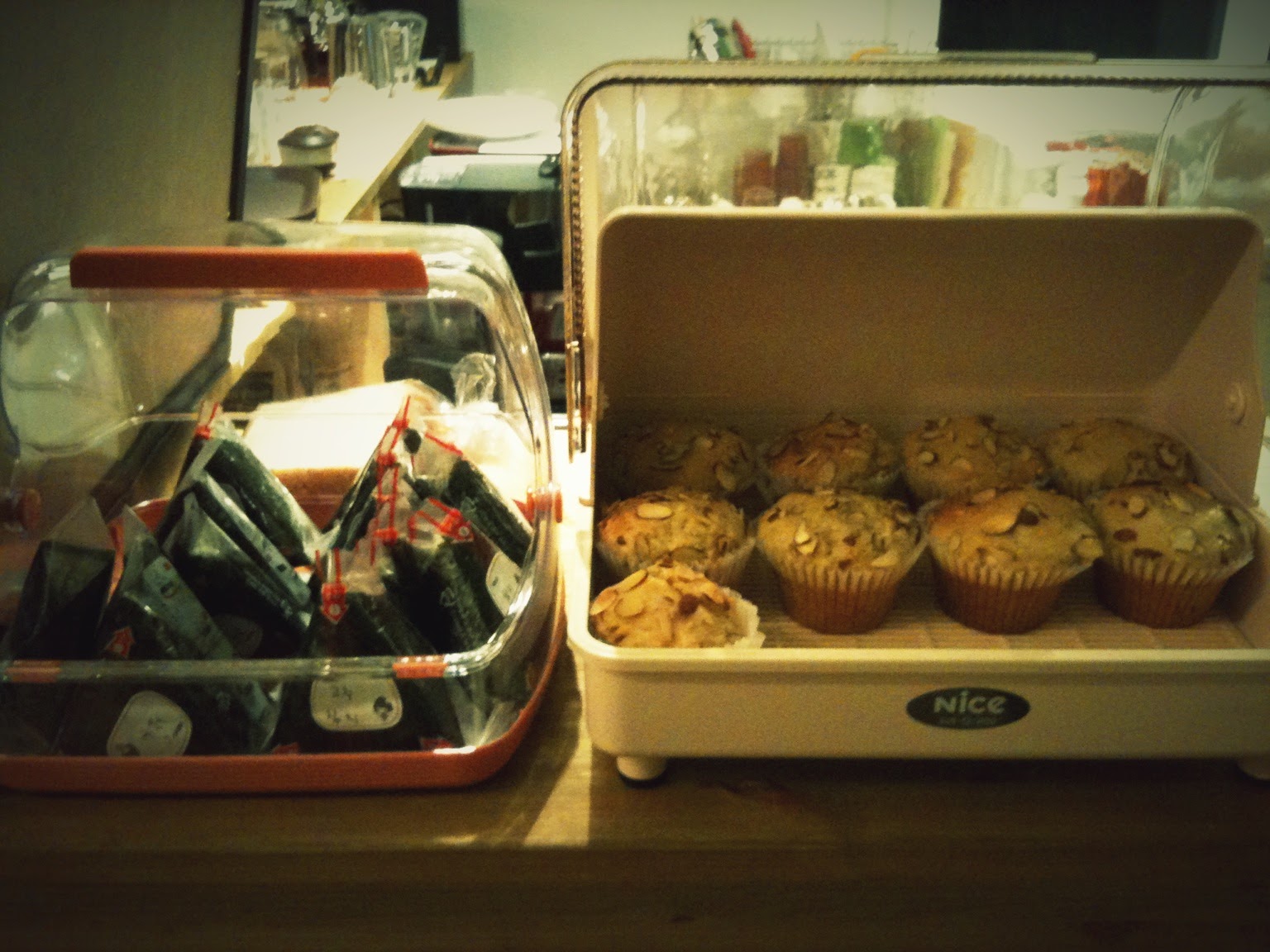 그리고 연잎차와 감잎차, 매실차 등을 드실 수 있어요. 간단하게 요기를 하실 수 있게 머핀과 삼각김밥, 토스트도 준비되어 있습니다.
