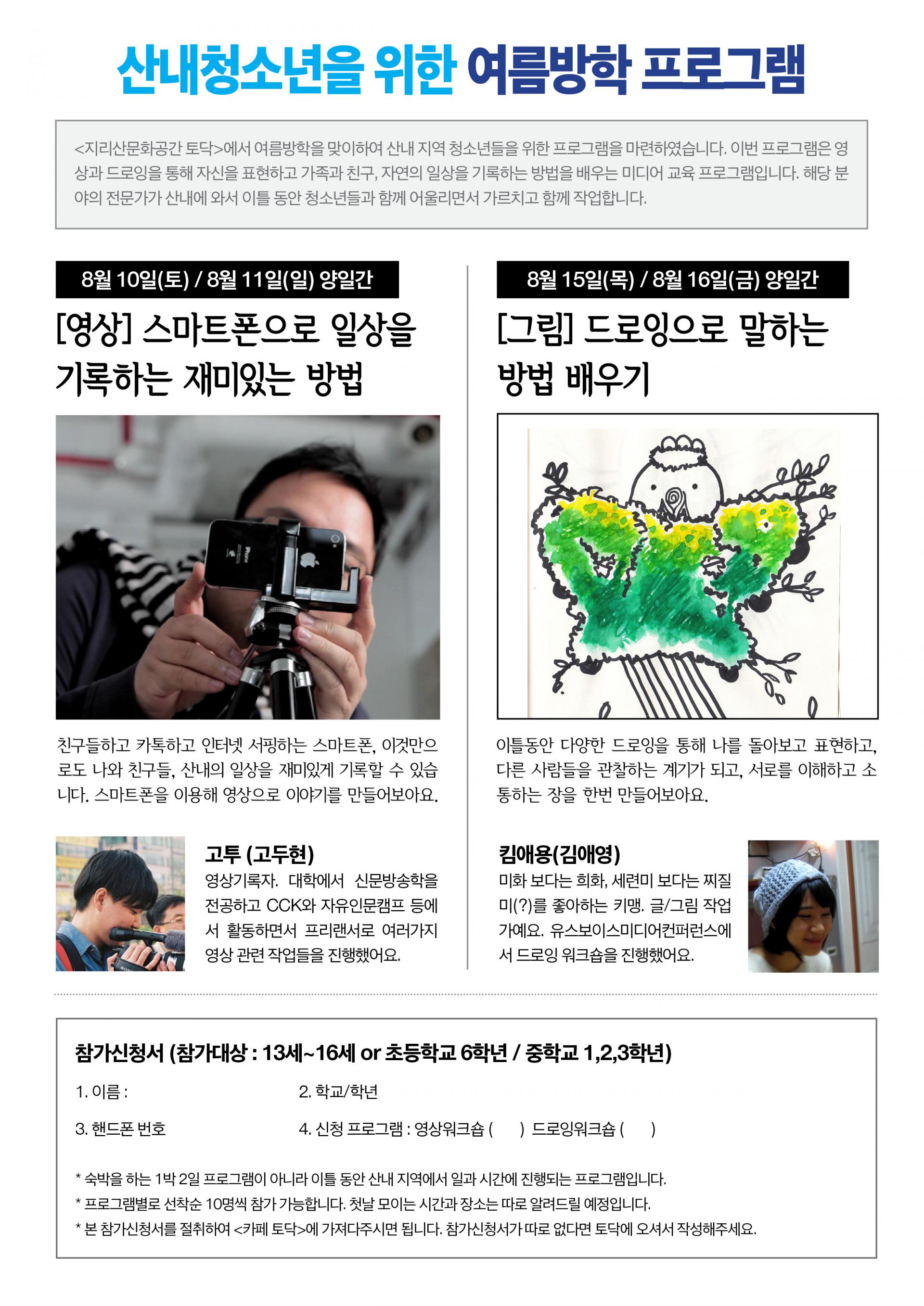 여름방학시간 동안 산내청소년들과 함께 아래와 같은 미디어 프로그램을 운영합니다.