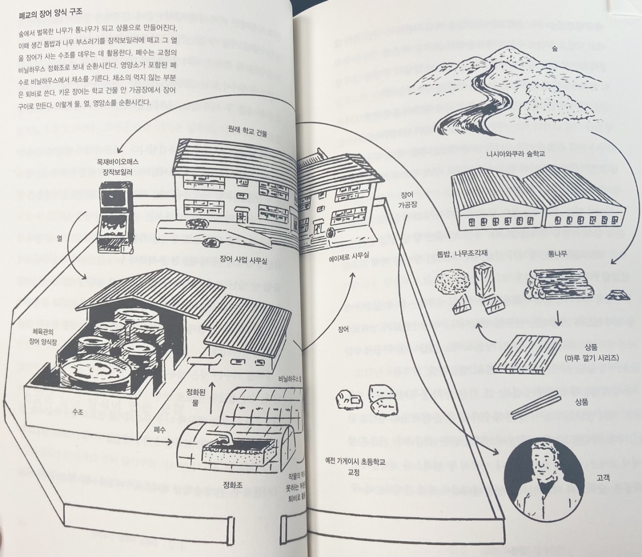 장어를 키우려면 25~30도의 따뜻한 물이 필요합니다. 그 수온을 유지하기 위한 연료로 숲학교 공장에서 버려지는 나뭇조각을 활용하면 되겠다고 생각한 것이 장어 양식을 시작하게 된 계기였습니다. 임업과 수산업을 연결한 것입니다. (p.46)