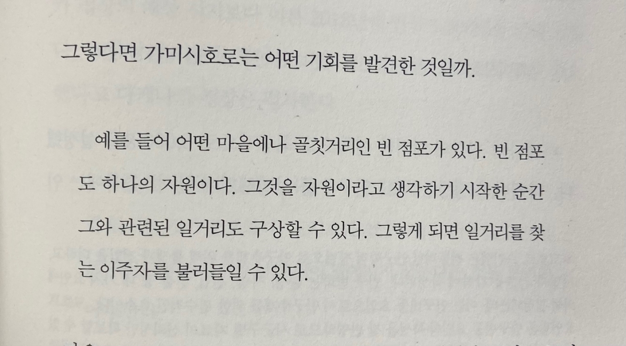 📚 <시골의 진화>에서 한 단락 "예를 들어 어떤 마을에나 골칫거리인 빈 점포가 있다. 빈 점포도 하나의 자원이다. 그것을 자원이라고 생각하기 시작한 순간 그와 관련된 일거리도 구상할 수 있다. 그렇게 되면 일거리를 찾는 이주자를 불러들일 수 있다." (p.133)