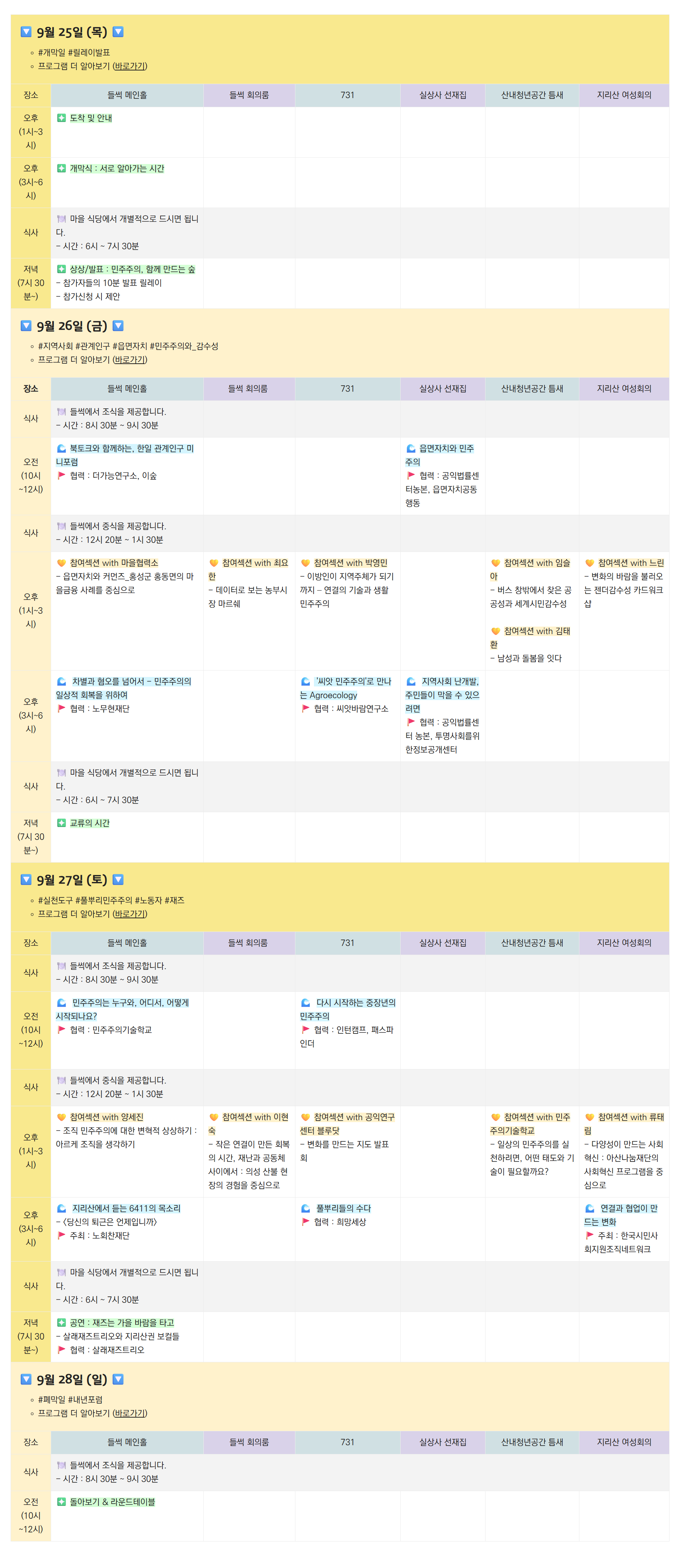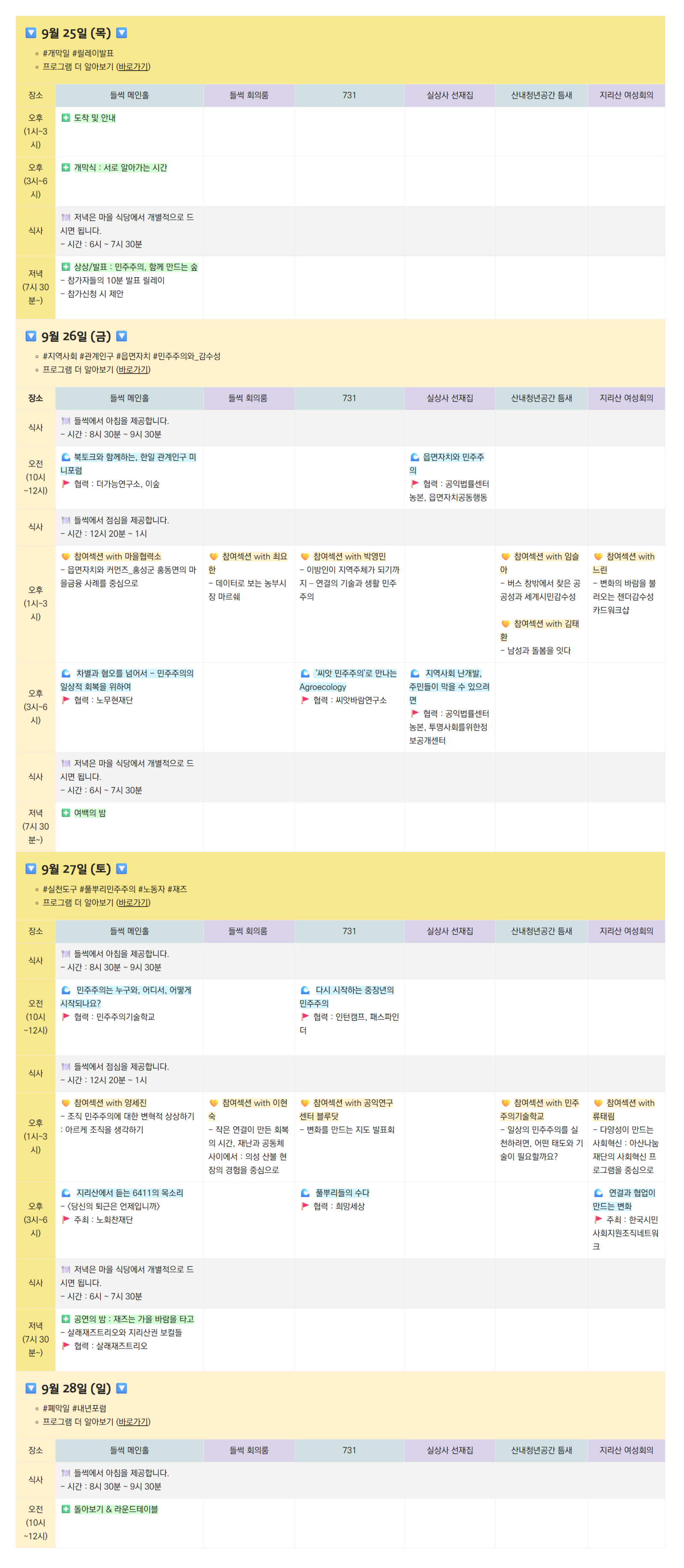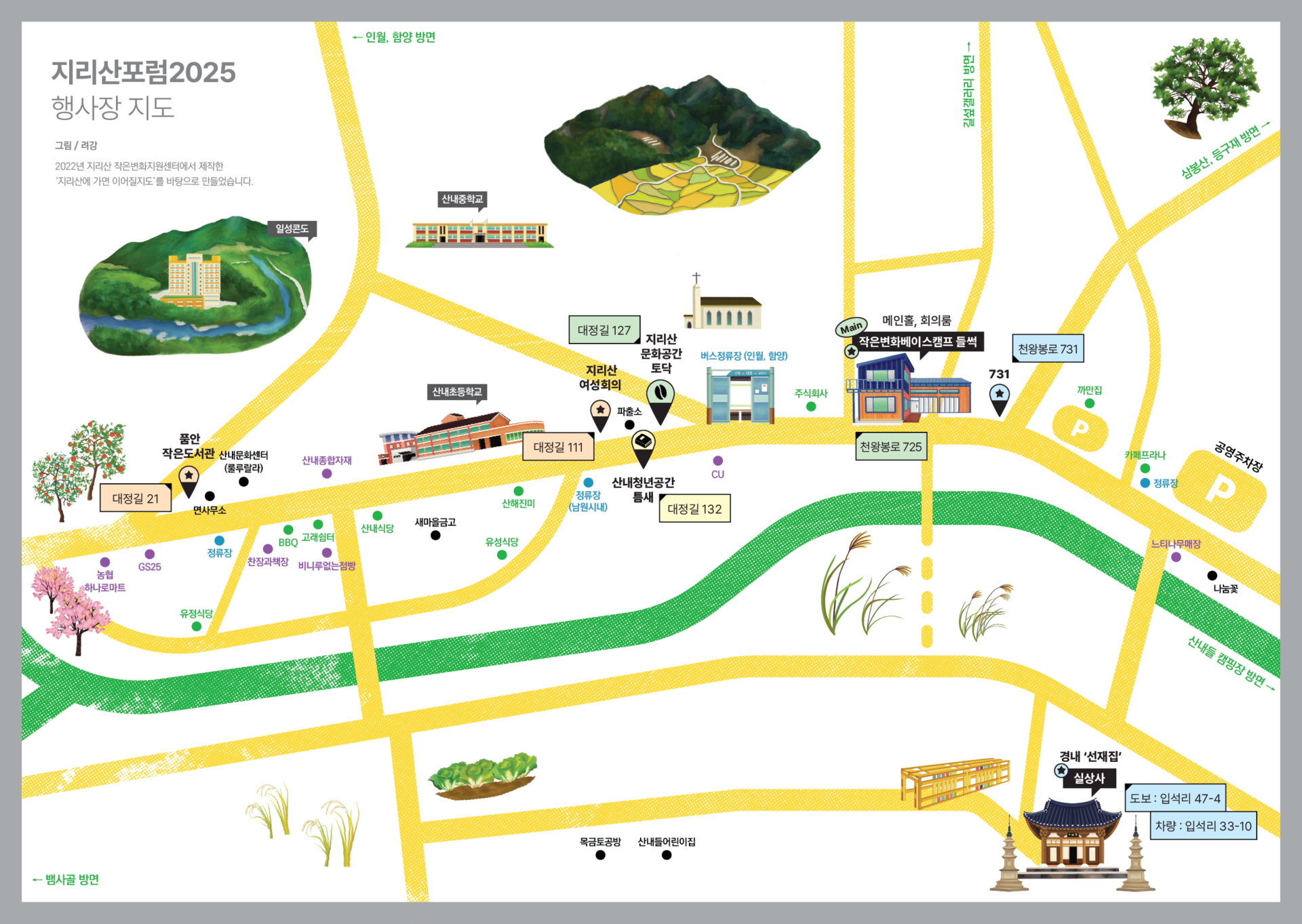 | 장소 | 작은변화베이스캠프 들썩 (천왕봉로 725) | 실상사 선재집 (도보 : 입석리 47-4 차량 : 입석리 33-10) | 산내청년공간 틈새 (대정길 132) | 지리산 여성회의 (대정길 111) |