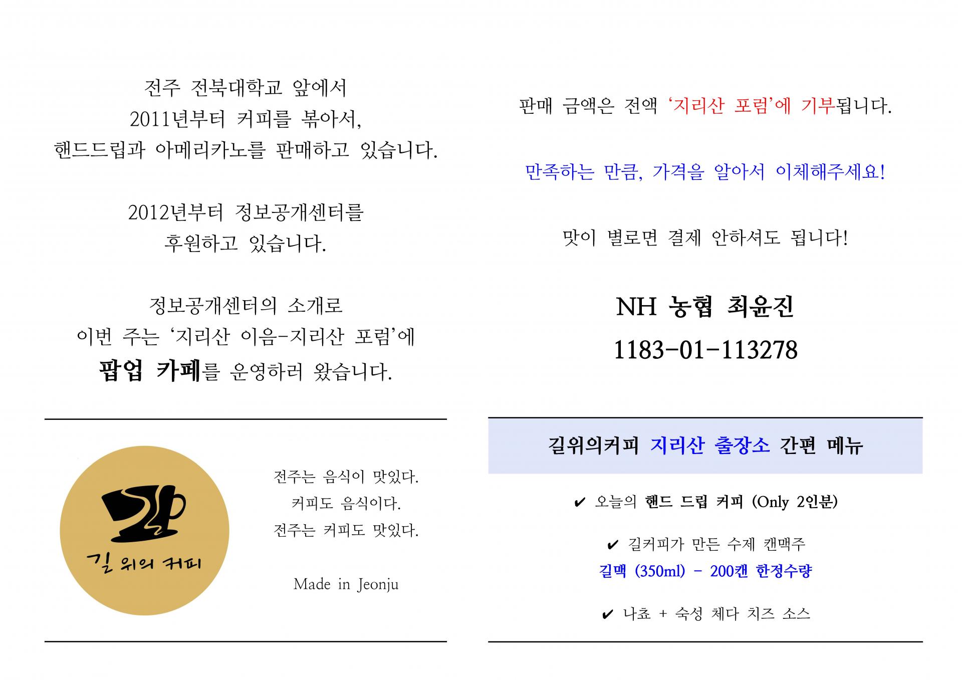 지리산문화공간 토닥 (산내면 대정길 127, 들썩에서 도보 5분)에서 길위의커피 지리산 출장소가 열립니다.