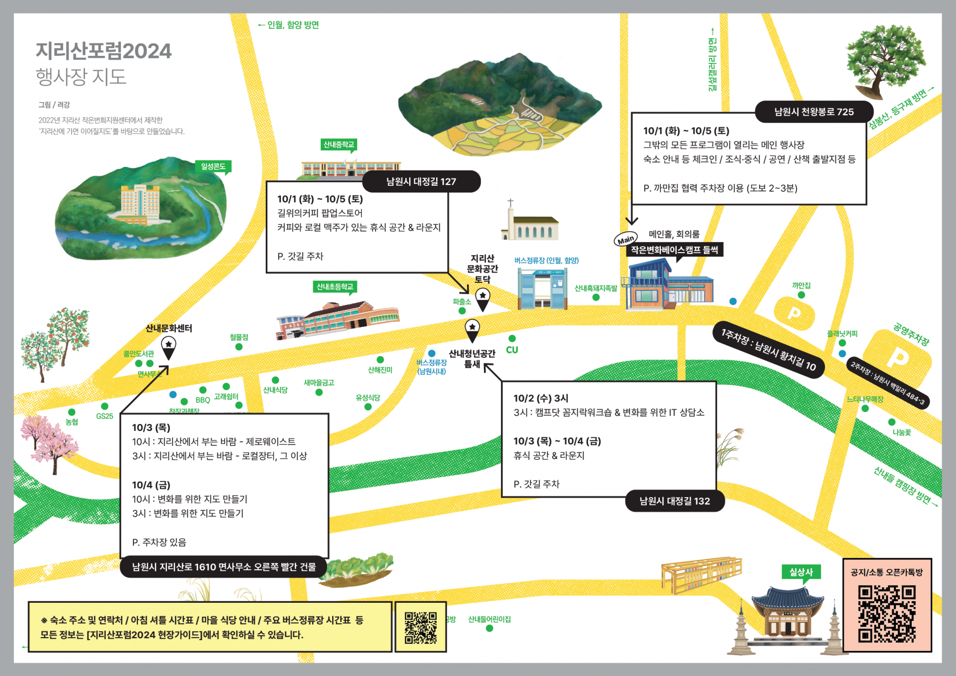 - 마을지도/셔틀/식당 : 지리산포럼은 산내 마을 전체에서 열립니다. 행사장, 숙소, 식당 위치와 셔틀 운영시간을 확인하실 수 있습니다.