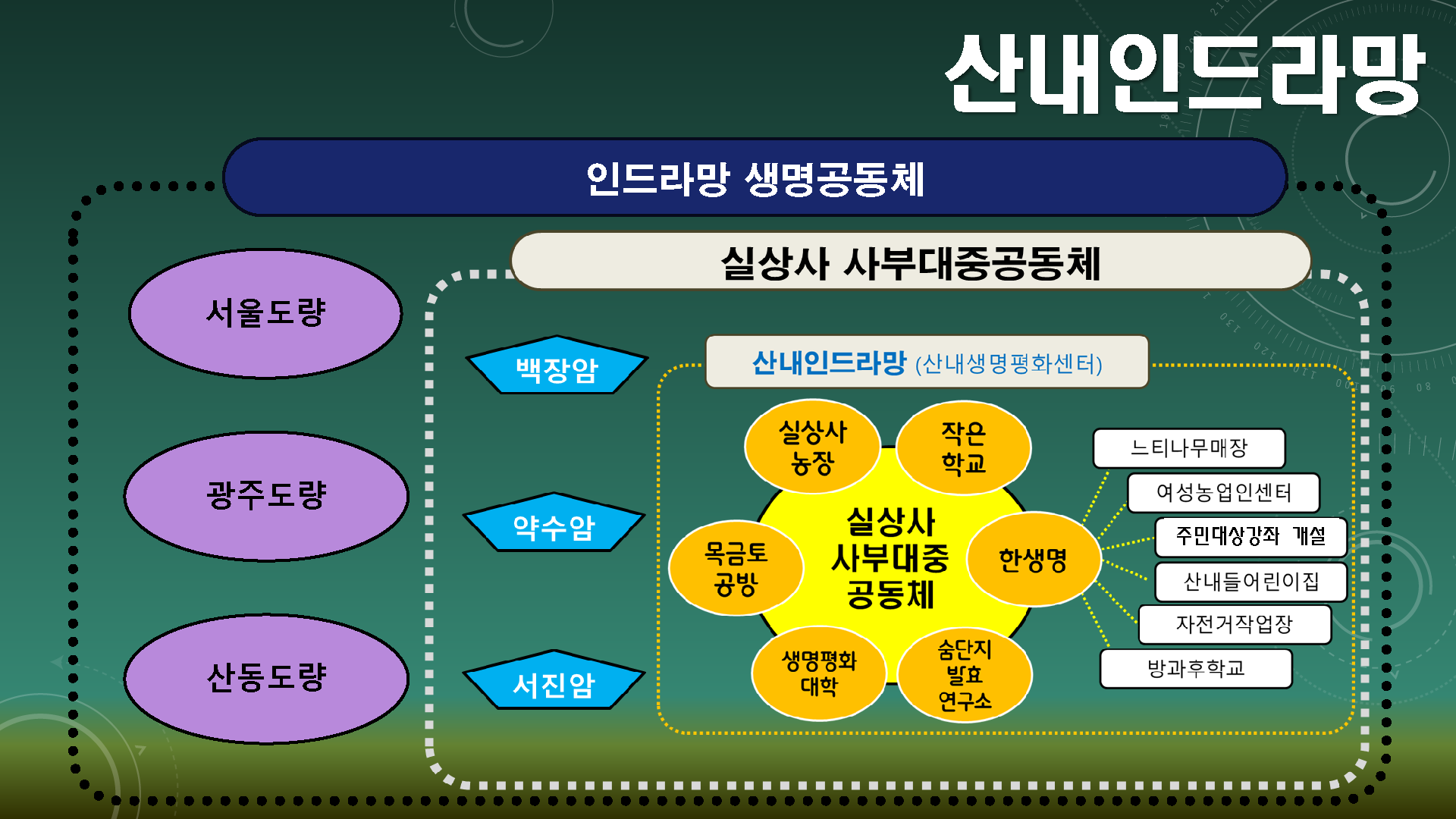 - 실상사, 한생명, 실상사농장, 실상사작은학교, 목금토공방, 숨단지 발효연구소 등 공동체 통합운영기구